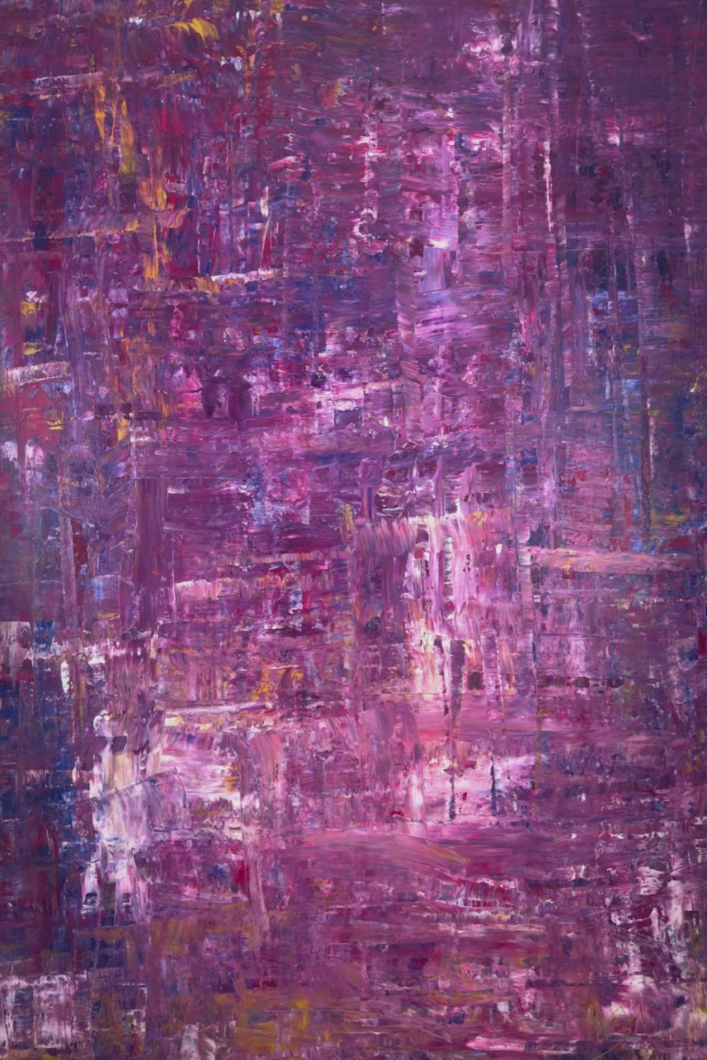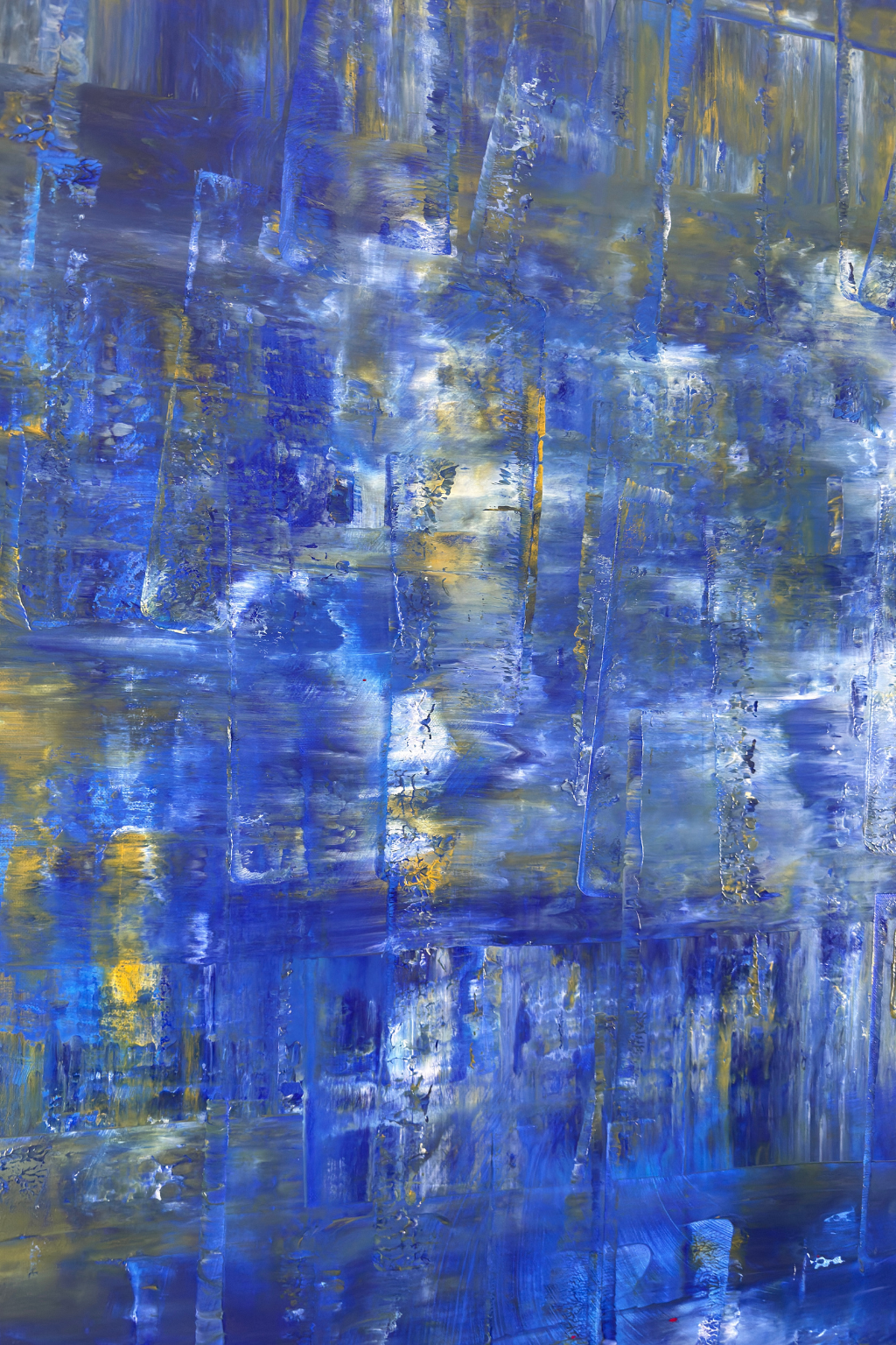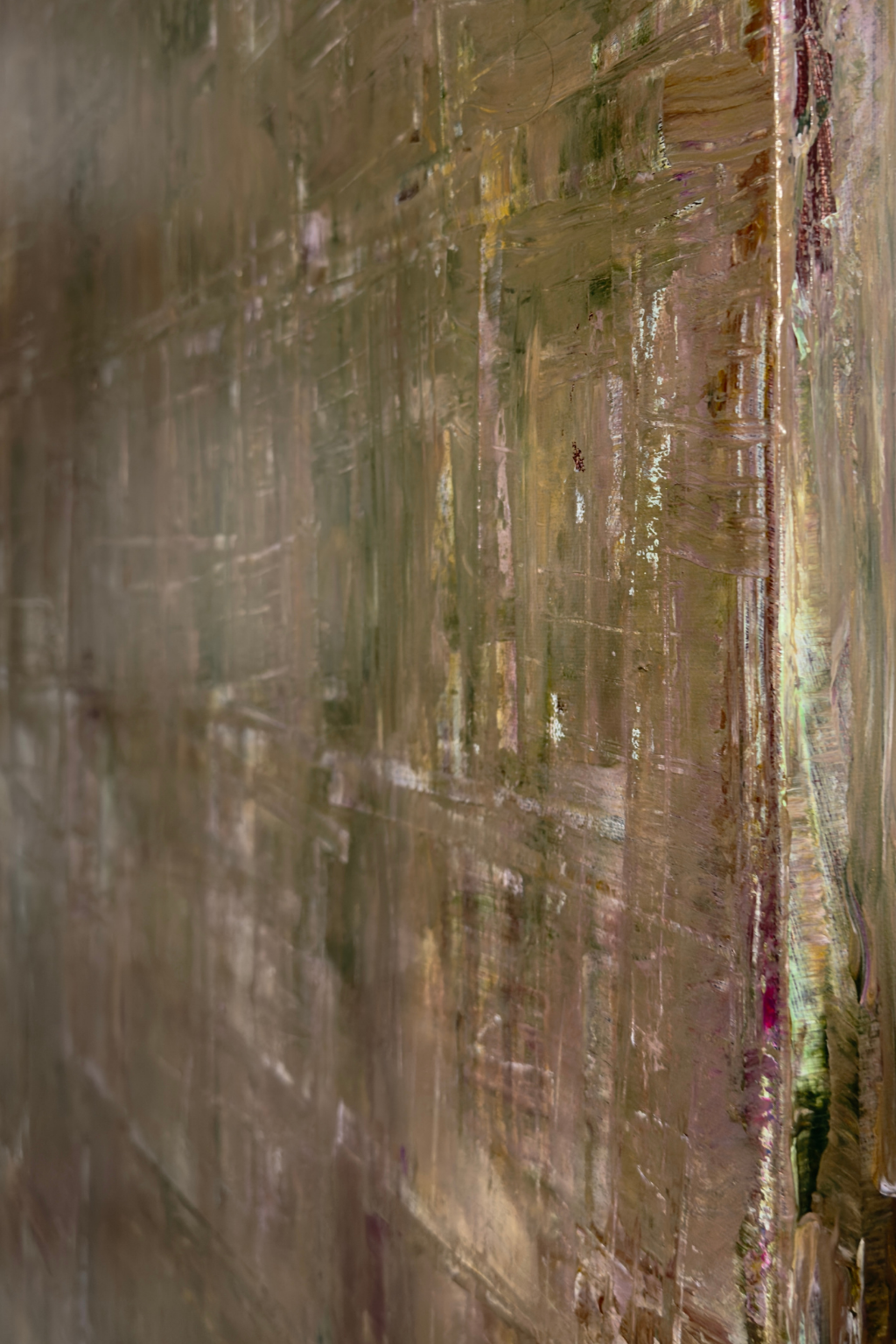 Die vier großformatigen Werke wurden in vielfältigen, sorgfältig aufgebauten Rakel-Schichten gestaltet. Jede Leinwand trägt zahlreiche Ebenen, die teilweise wieder geöffnet, überarbeitet und harmonisiert wurden. So entstehen Tiefenzonen, Lichtbahnen und feine Übergänge, die sich über alle vier Werke hinweg zu einer gemeinsamen „Energielinie“ verbinden.