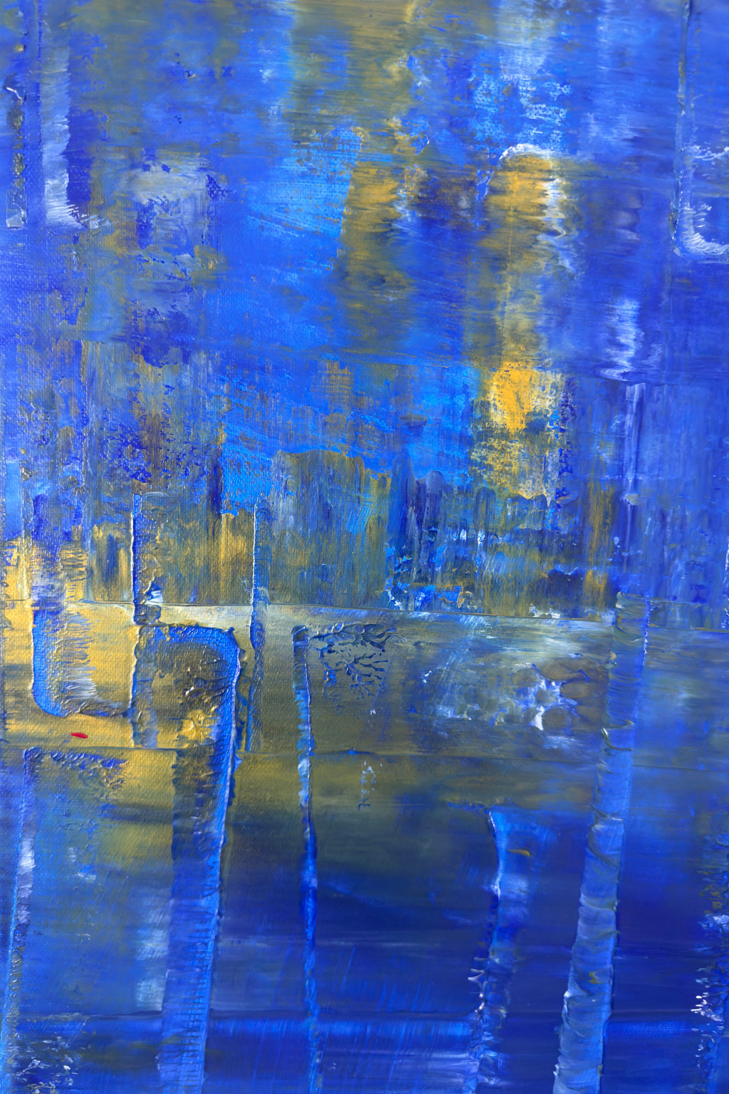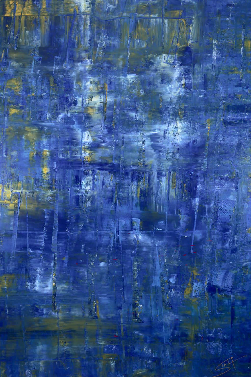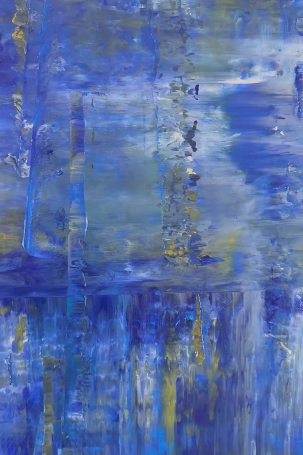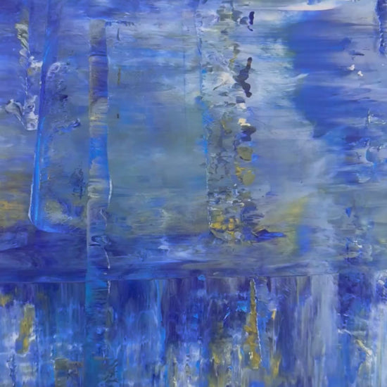 Ein Spektrum aus Blau, Türkis und Petrol, durchzogen von gebrochenem Weiß und feinen Goldadern. Die Rakelbewegungen erzeugen wellenartige Bahnen und Strömungen – wie Meeresoberflächen oder Wasserläufe aus der Vogelperspektive. Kleine rote und goldene Akzente setzen pulsierende Energiepunkte, die an Lichtreflexe auf Wasser erinnern.