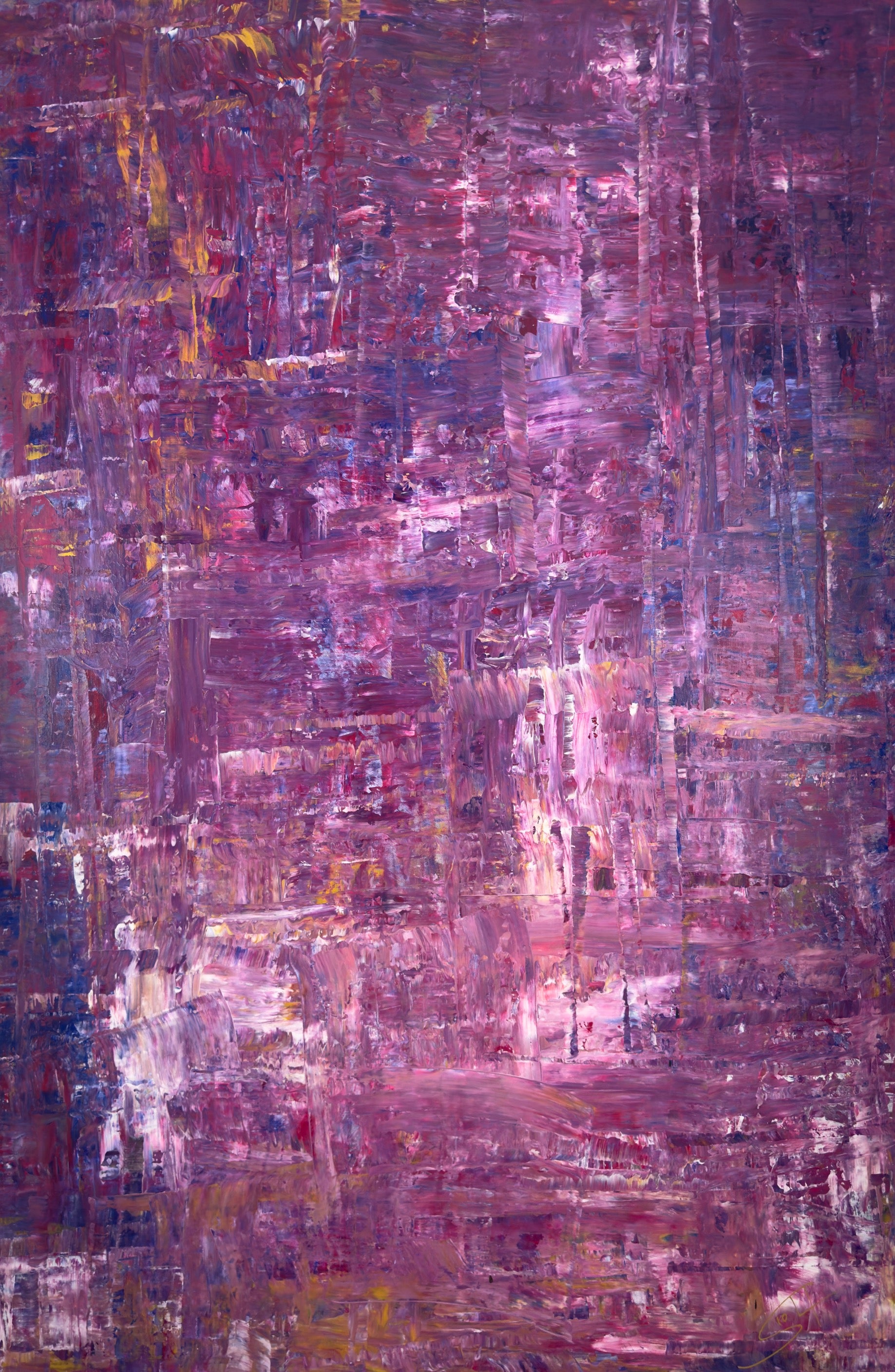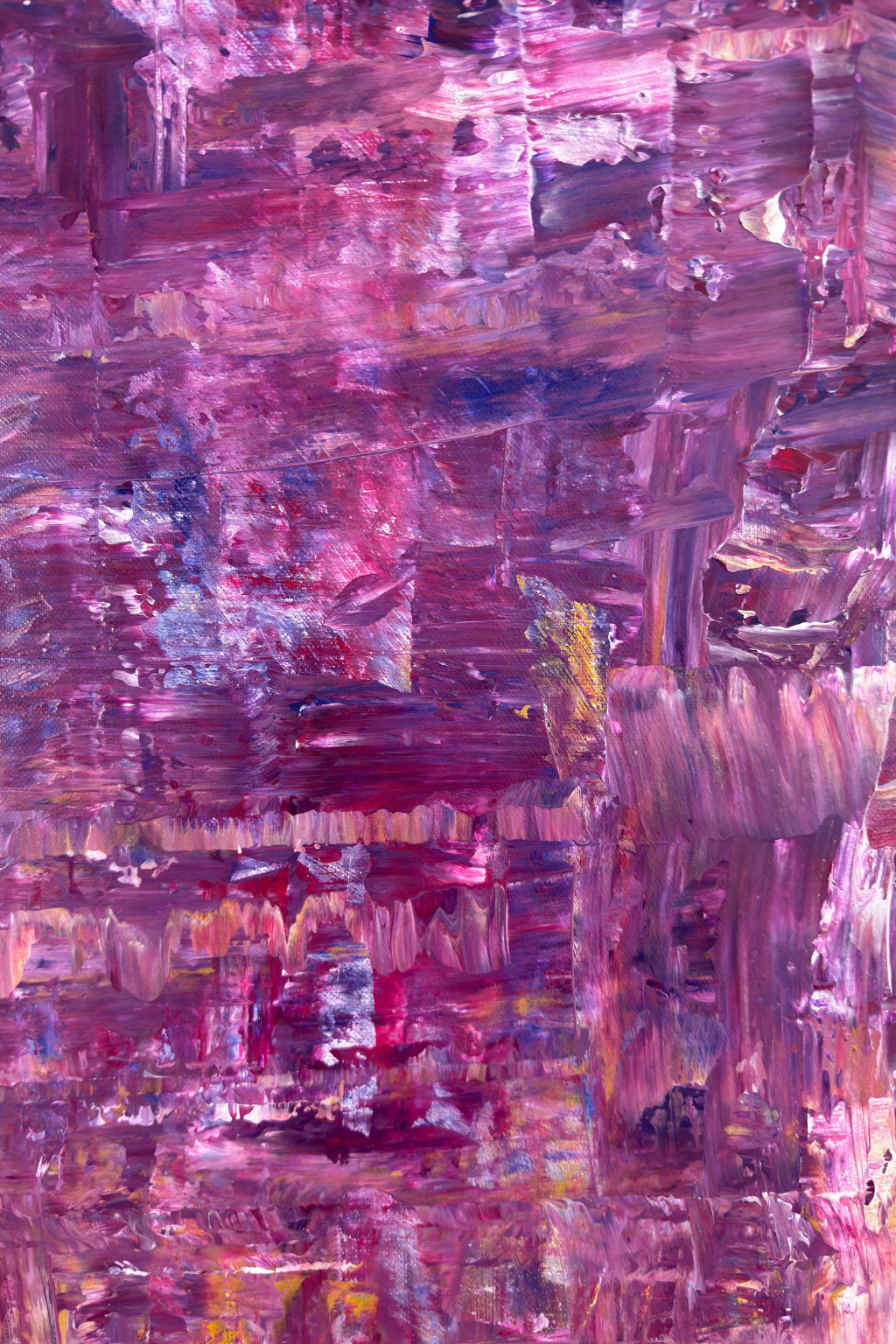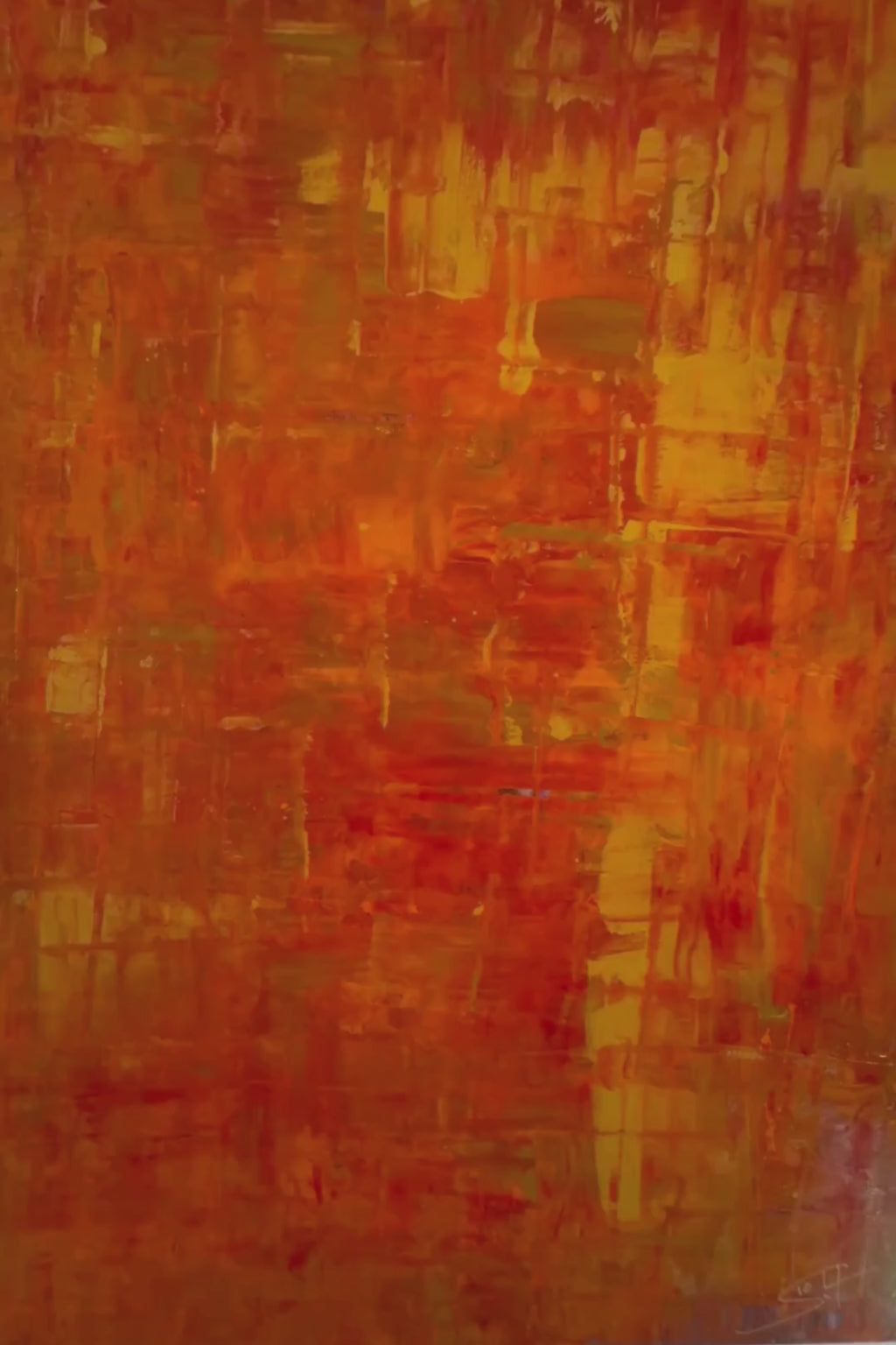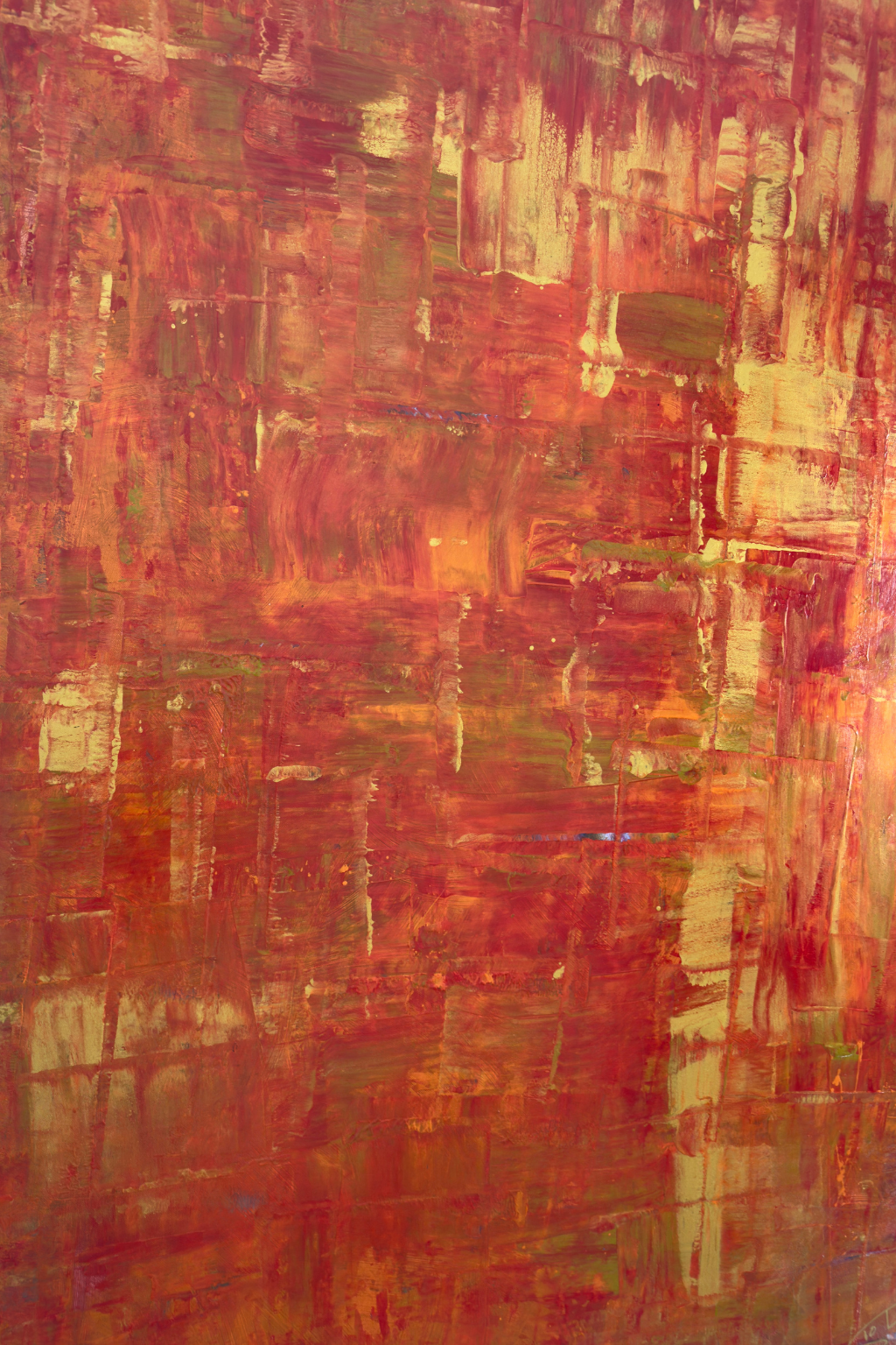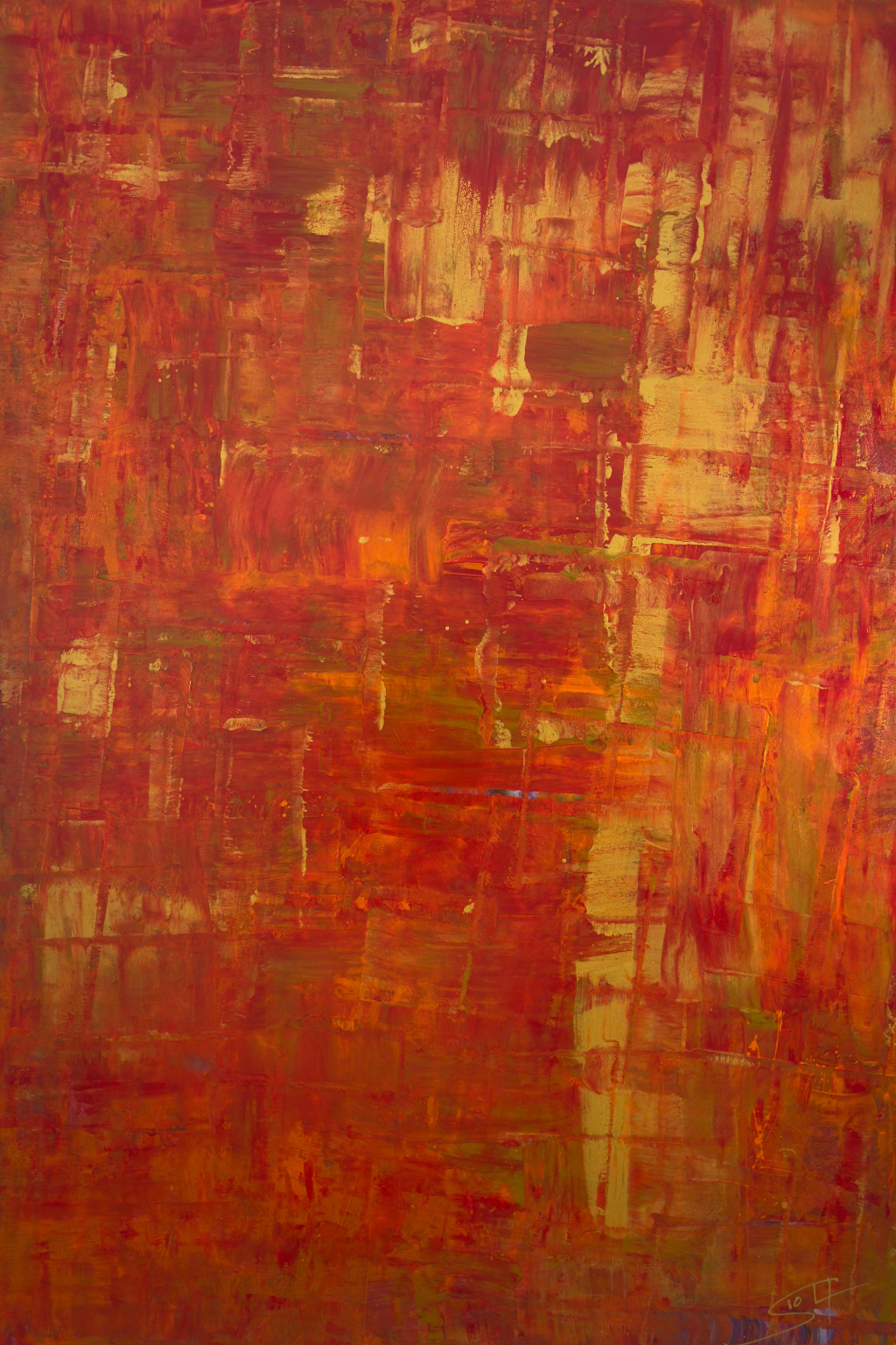Tiefe Rot-, Magenta- und Orangetöne dominieren dieses Werk, durchzogen von goldenen Linien und Öffnungen, die an Funken, Glut und aufsteigende Hitze erinnern. Die Komposition trägt bewusst mehr innere Spannung und Verdichtung – wie ein konzentrierter Ausbruch von Energie.
