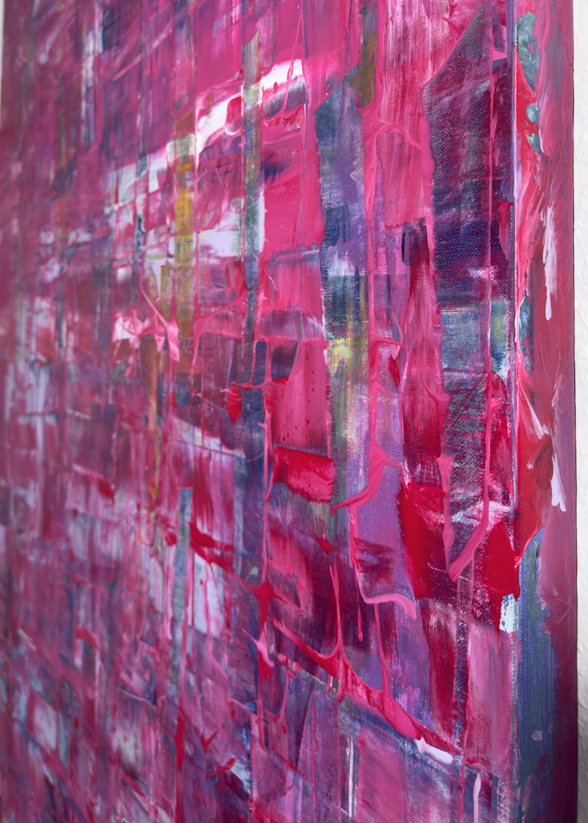 Die Farbmasse wurde teilweise so kraftvoll gezogen und geschoben, dass plastische Grate, Kanten und Tropfen entstanden, die dem Werk eine haptische Präsenz geben. Die gestalteten Seiten des 3,5-cm-Keilrahmens führen die Komposition über die Kanten hinaus und machen das Bild zu einem eigenständigen Objekt im Raum, das aus verschiedenen Blickwinkeln immer wieder neue Details zeigt.