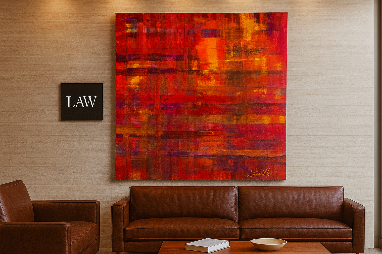 Die dominierenden Rot-, Orange- und Ockertöne transportieren Wärme, Energie und eine ruhige, konzentrierte Leidenschaft – eher wie die Glut unter der Oberfläche als wie ein grelles Feuer. Die Goldpartien stehen für Wert, Reichtum und Beständigkeit, ohne dekorativ zu wirken; sie fügen sich organisch in die Farbfelder ein und erinnern an goldene Reflexe in der gleißenden Mittagssonne. Dunkle, fast schwarze Bereiche und tiefes Blau bringen Bodenhaftung und Tiefe in die Komposition – visuell das „schwarze Gold“, das unter allem liegt. In Räumen erzeugt „Gold in the Desert“ eine kraftvolle, aber geerdete Atmosphäre: Es wärmt, fokussiert und setzt ein klares Statement, ohne optisch zu laut zu werden.