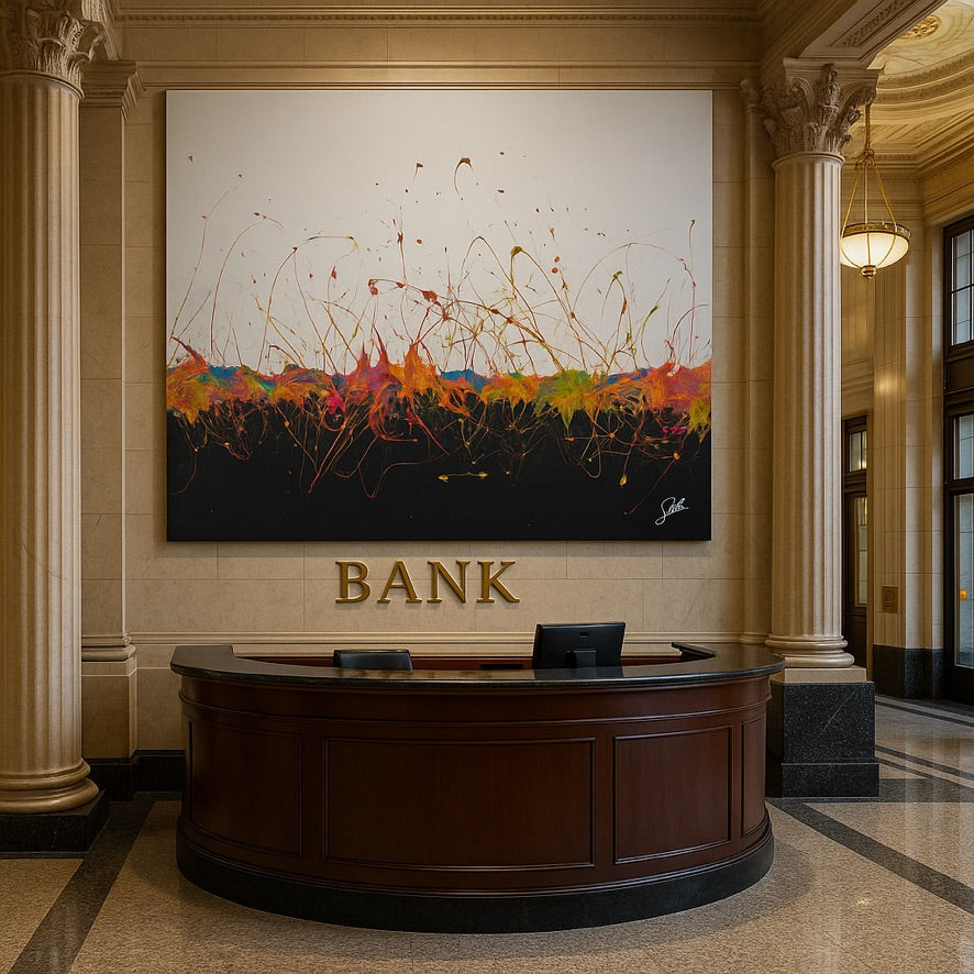 Farben schießen wie Funken aus einem tiefen Schwarzfeld nach oben: Neon-Gelb, Magenta, Blau, Grün und Orange stoßen zusammen, verzweigen sich, ziehen Spuren und Tropfen ins Helle. „Jumping Colors 2 – Limited Series“ wirkt wie der Moment, in dem in einem Raum voller Menschen plötzlich alles klickt – Ideen prallen aufeinander, Talente ergänzen sich, Projekte greifen ineinander. Das Werk ist Teil einer bewusst klein gehaltenen „Jumping Colors“ Limited Series: wenige großformatige Originale, jedes mit eigener Komposition, aber derselben explosiven Energie von Vielfalt und Bewegung.