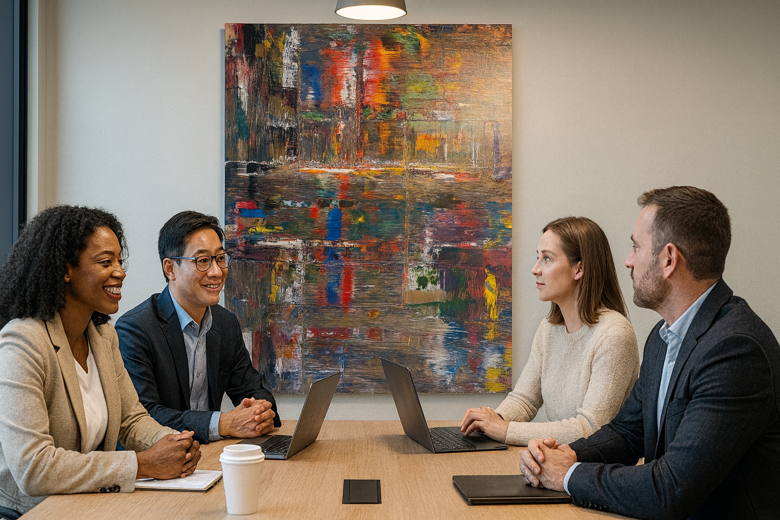 „Organized Chaos“ eignet sich hervorragend für repräsentative Geschäftsbereiche: Empfangs- und Wartezonen, Besprechungsräume, Kanzleien, Beratungen, Agenturen oder moderne Vorstandsbüros, in denen ein bewusst gesetztes Statement zeitgenössischer Malerei gefragt ist. Im privaten Umfeld funktioniert das Werk besonders gut über Sofalandschaften, an Essbereichswänden, in offenen Loft-Situationen oder in großzügigen Fluren. Das Format 80 × 100 cm bleibt dabei flexibel genug, um sowohl in größeren Räumen als auch auf begrenzteren Wandflächen markant zu wirken.