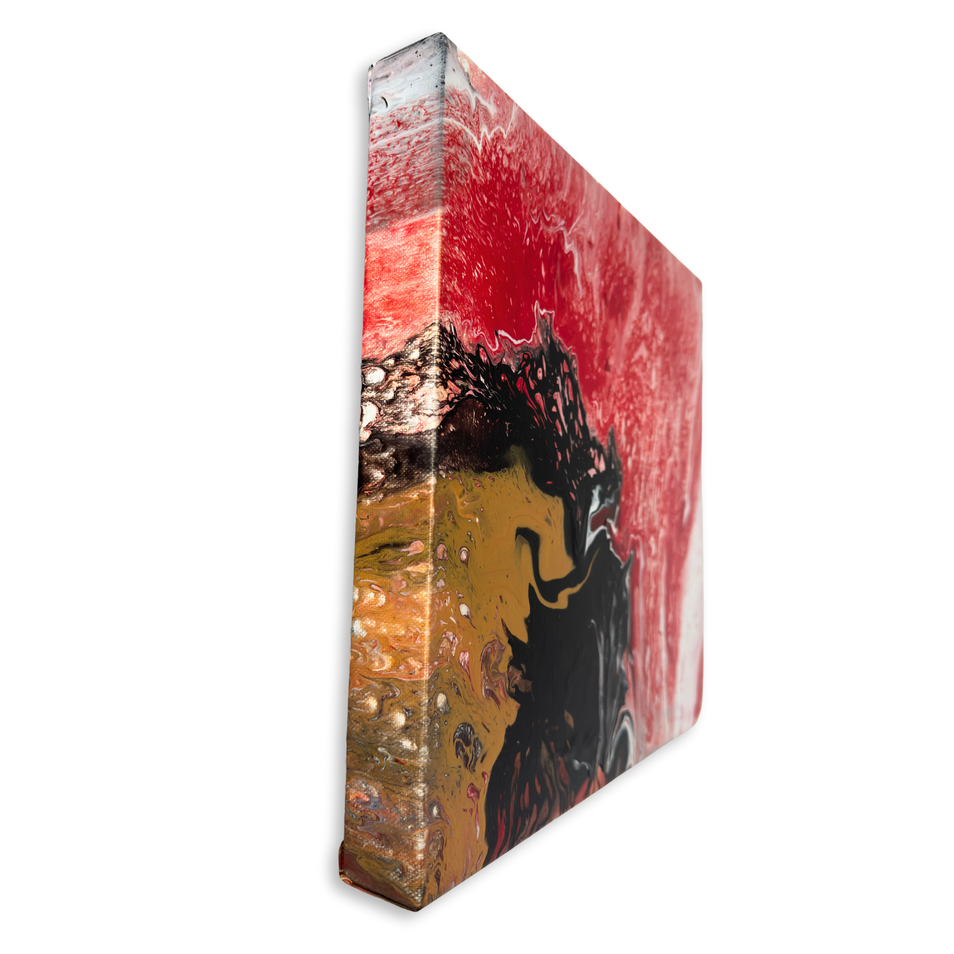 „Samurai“ ist eine kraftvolle abstrakte Fluid-Art-Arbeit: Expressives Rot wird von tiefem Schwarz durchbrochen, begleitet von warmen Goldtönen und hellen Strukturen. Die scharfen Kontraste und fließenden Kanten wirken wie ein kontrollierter Schnitt durch Bewegung – konzentriert, entschlossen, präsent. Im Format 50 × 50 cm setzt das Werk einen markanten Akzent mit moderner, energiegeladener Ausstrahlung.