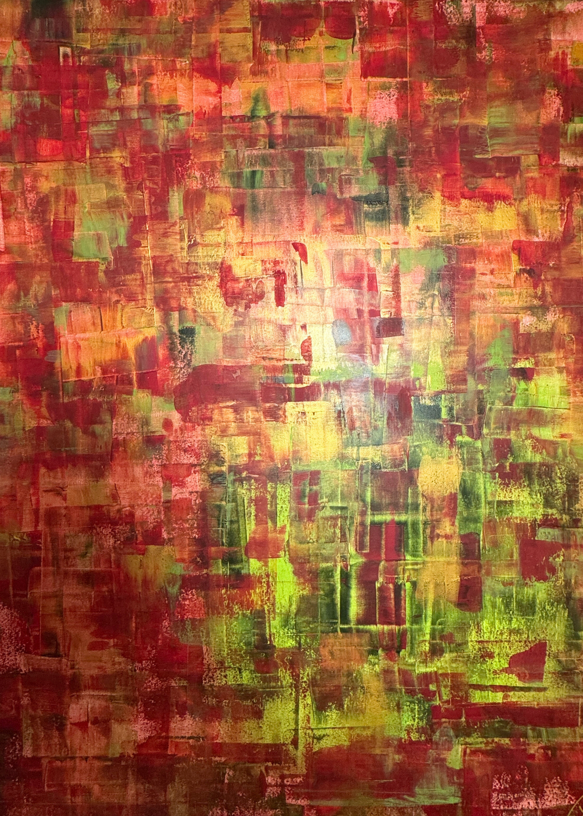 Die dominierenden Rot- und Dunkelrotbereiche verweisen auf Blut, Leidenschaft und Urkraft – sie stehen für das unmittelbare, rohe Leben im Dschungel. Das giftige Grün und die leuchtenden Gelbnuancen erinnern an Warnfarben von Pflanzen und Tieren: attraktiv, aber eindeutig mit Signalwirkung. Dazwischen legen sich goldene Schichten und Reflexe, die im Licht wie kleine Goldadern aufglimmen und Assoziationen von Reichtum, verborgenen Chancen und innerem Schatz wecken.